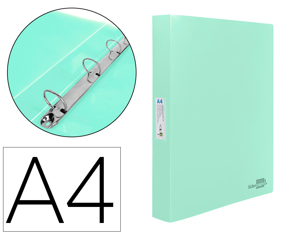 Classeur liderpapel 4 anneaux en d 25mm a4 polypropylene feuillets mobiles 100f 5x5mm coloris menthe