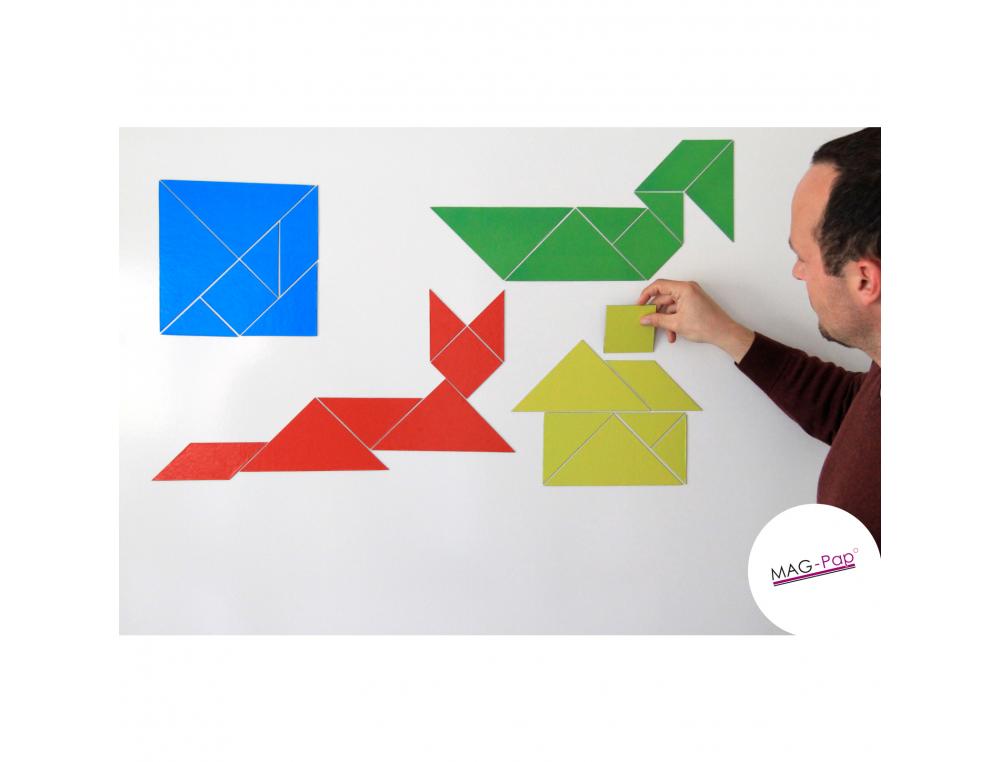 - Composition : Chaque tangram se compose de deux grands triangles, un triangle moyen, deux petits triangles, un carré et un parallélogramme.
