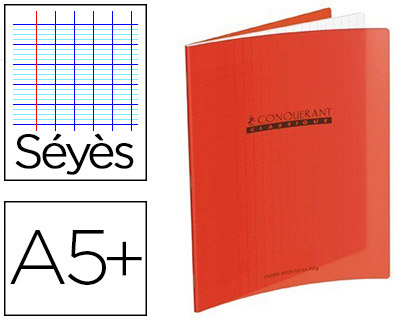 - Titre du Produit: Cahier Piqué Conquérant Classique Couverture Polypropylène Rigide Transparente A5+ 17x22cm 60 Pages 90g Séyès Rouge