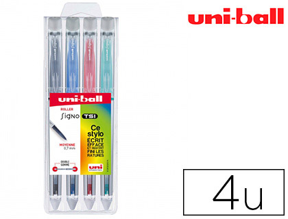 Pochette uniball signo roller encre gel ecriture large broad creatif coloris blanc / bleu rose violet metal 4