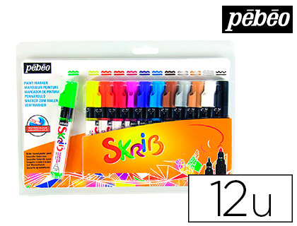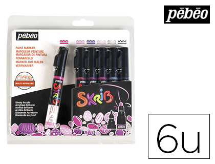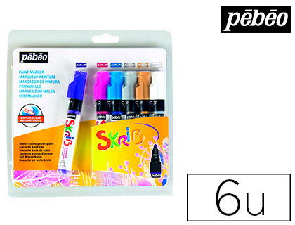 Marqueur peinture pébéo skrib gouache classique mèche 0,7/4mm coloris bleu rouge jaune vert blanc et noir 6 unités